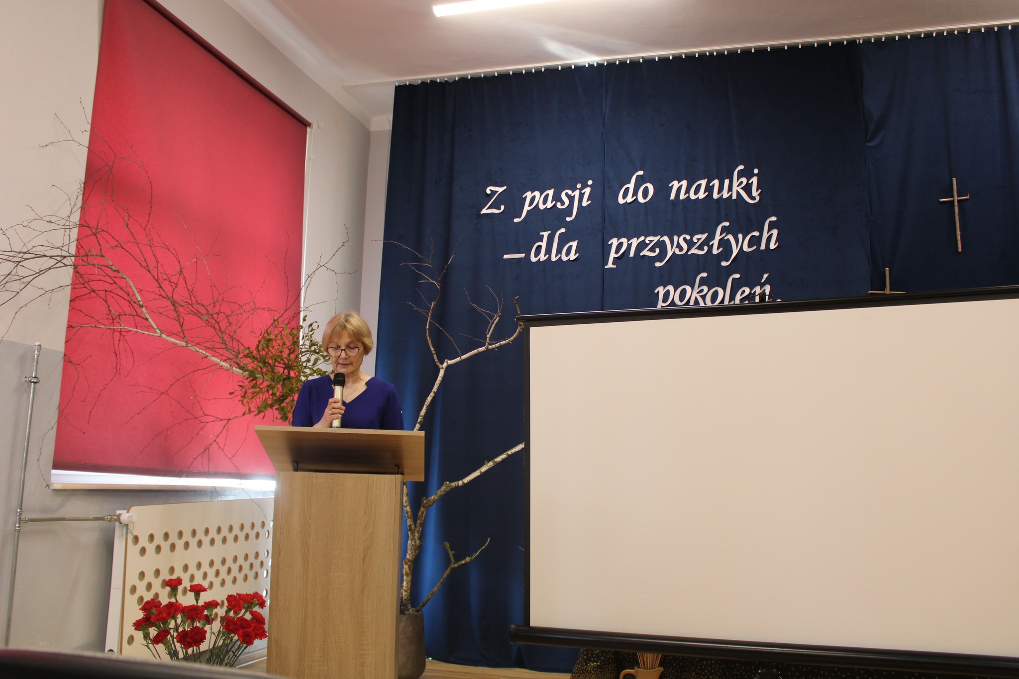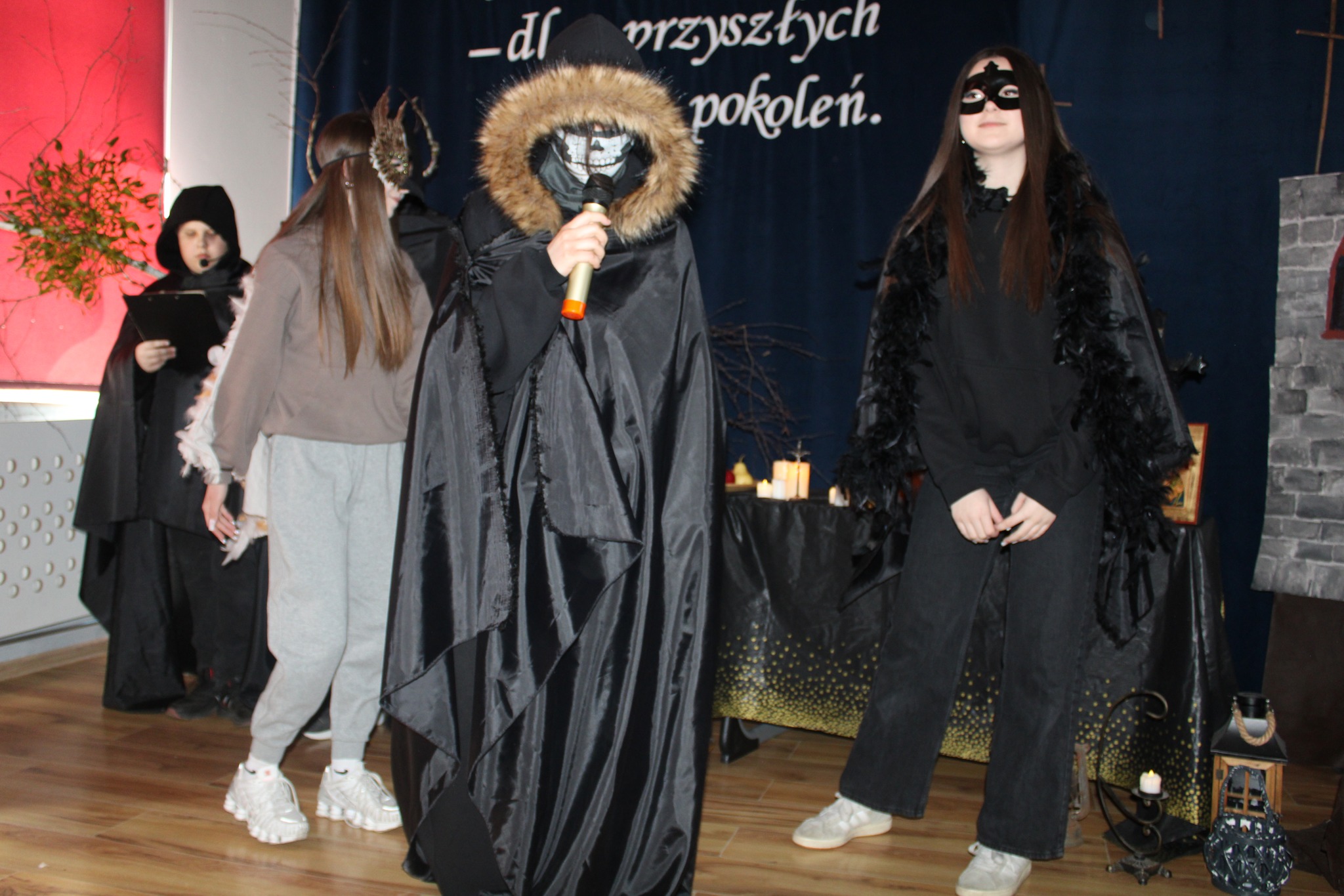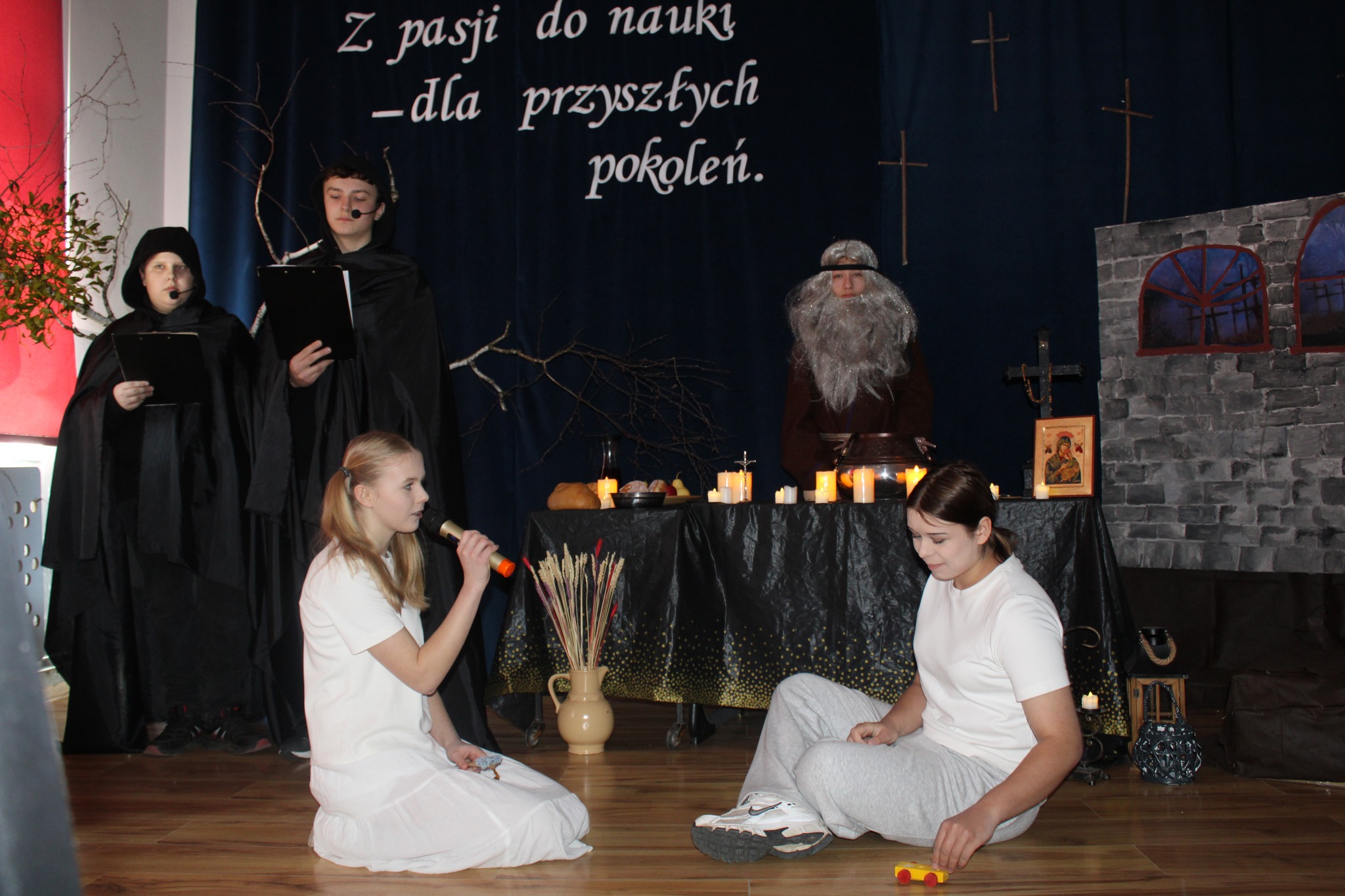 Uczniowie z panią Agaty Dymel-Mikiciuk, przygotowali poruszający fragment „Dziadów”, a chór zadbał o piękną oprawę muzyczną pod kierunkiem pani Kamili Olszewskiej.